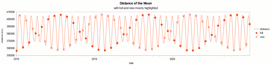月亮和地球的距离变化(横轴:时间,纵轴:地月距离;圆点:满月,十字:新月)图自wikipedia