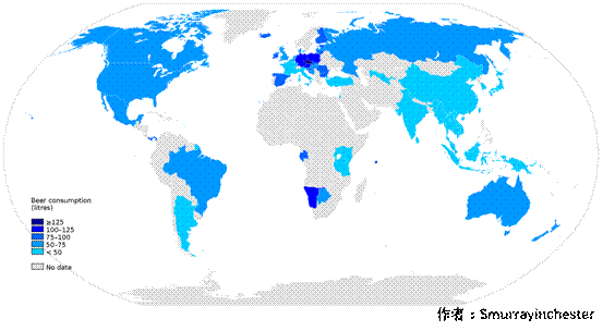 2012年全球各国啤酒消费量,颜色越深消费越多(来源见图)