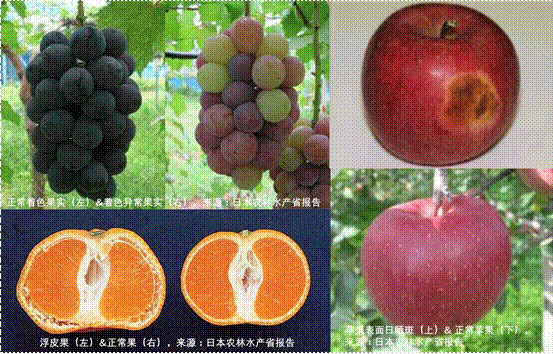 除了大麦,日本农林水产省每年都会发布一次全球变暖对日本全国农作物影响状况的报告,2017年的版本显示,由于夏季频发的高温特别是夜间高温,多个水果产地出现苹果日晒斑、葡萄着色不良等问题。而早春频发的异常高温对农业生产的影响则更加严重。多种作物的发芽、开花等行为受高温影响提前后,一旦遭遇突发降温,很可能发生霜冻,严重影响当年收成。夏季高温造成的秋季多雨还会导致柑橘出现“浮皮果”,从而影响柑橘品质和贮藏时间。