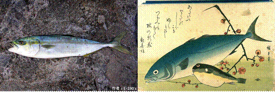 青甘鱼幼鱼,主题为河豚和青甘鱼的浮世绘(创作于江户时代)(来源见图)