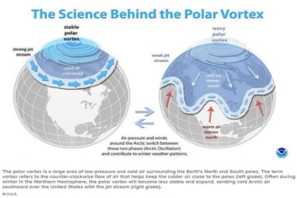 但是近十几年来,全球变暖,北极海冰消融变薄,极地吸收了更多的太阳辐射,导致北极地区气温上升的速度比中高纬度地区更快,这种现象被称为北极增暖效应,又叫北极放大效应。目前北极地区是全球平均增暖的2倍,因此南北温差变小,原有的温度梯度遭到破坏,西风带流速减弱,流动方向变得弯弯曲曲,成波浪状。原有的平衡被打破,暖空气向北,冷空气向南,极涡变得扭曲,冷空气便不能再稳固地封锁在北极地区。当极涡向南移动,侵入中纬度地区,其所携带的冷空气,便不得不让原本宜居的中纬度地区体验下爱斯基摩人的天寒地冻了。