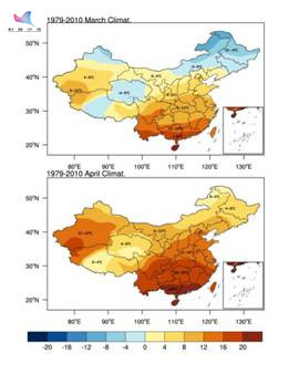 图为1979-2010年3月和4月全国平均气温分布图。李慧 制图