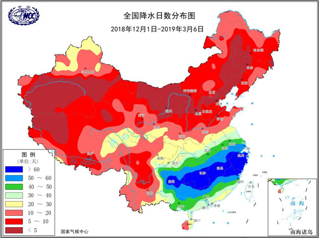 2018年12月1日至2019年3月6日全国降水日数分布 图来源:国家气候中心