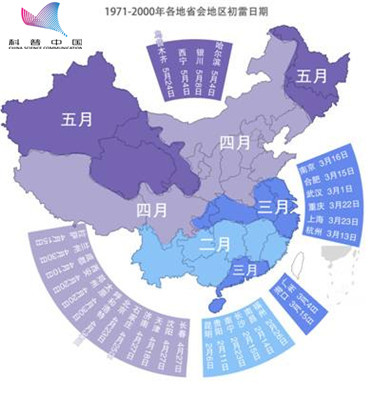 图为1971-2000年各地省会城市初雷日期。赵淼 李慧 制图