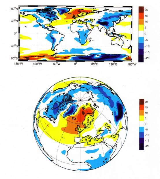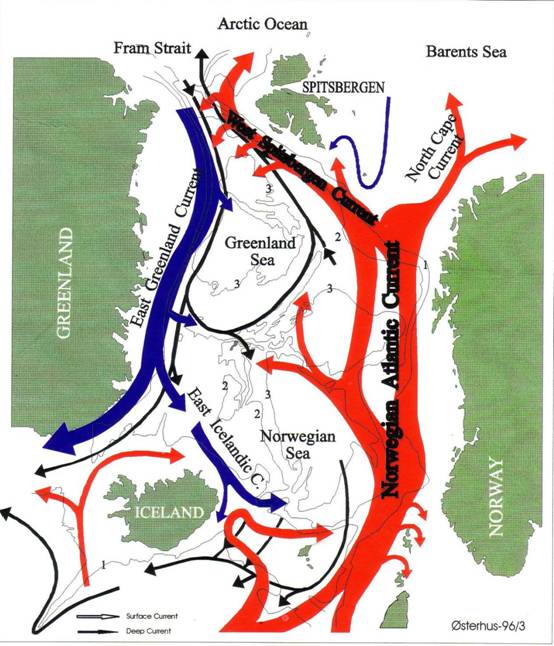 据海洋大气学家计算,自南向北输送的北大西洋暖流可以使挪威海域上空的大气每年升温约达摄氏20度。从多年平均的北半球地面气温来看,沿斯堪的纳维亚半岛和斯瓦尔巴地区的年平均气温要比同纬度其他地区高5-20摄氏度。