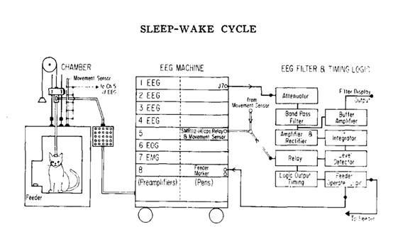 猫猫的睡眠测定 图源:Lucas, E. A., & Sterman, M. B. (1974). The polycyclic sleep-wake cycle in the cat: Effects produced by sensorimotor rhythm conditioning. Experimental Neurology, 42(2), 347–368. doi:10.1016/0014-4886(74)90032-6