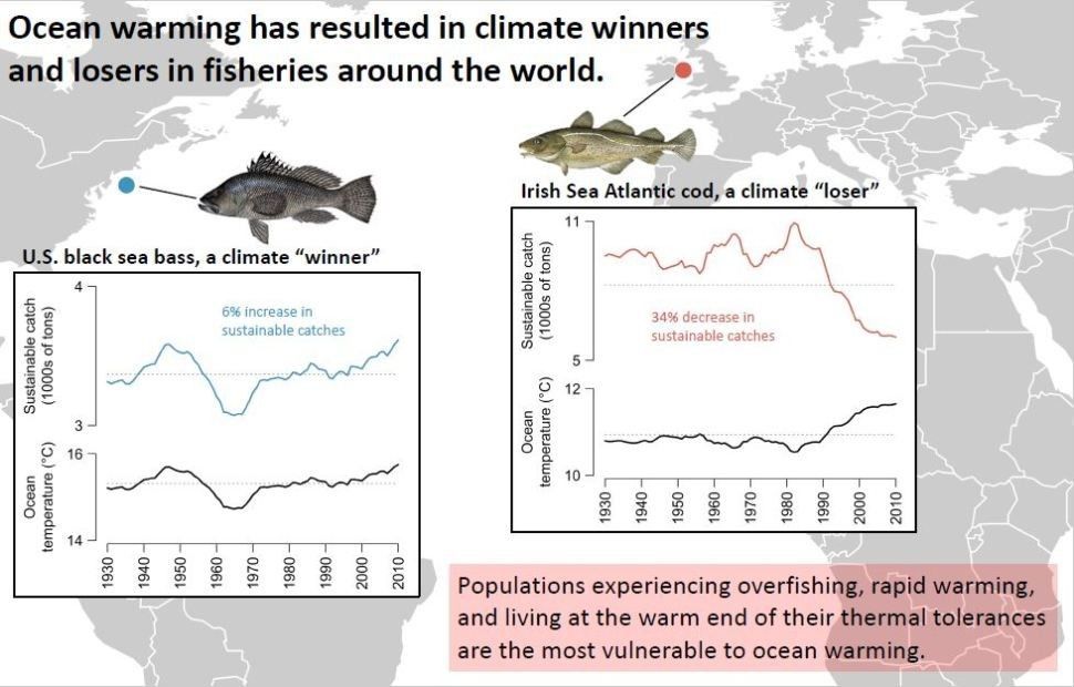 美国罗格斯大学的一项新研究回顾了自上世纪30年代以来全球鱼类资源发生的变化,发现在过去的80年里,鱼类资源损失了4.1%,即14亿吨[4]。研究人员调查了分布在38个海洋区域的235个鱼类和贝类种群从1930年到2010年的变化。平均而言,地球表面的海洋温度在这段时间内上升了大约0.5℃。被评估种群的最大可持续产量下降了4.1%,其中5个生态区遭受了15 - 35%的损失。过度捕捞加剧了这种下降。捕鱼量巨大的日本海,可持续捕鱼量的下降高达35%。在被研究的鱼类和贝类种群中,约有8%的鱼类和贝类种群由于海洋变暖而遭受损失,其中大西洋东北部的鱼类(如鳕鱼)急剧下降了34%。