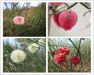 我们兄弟姐妹很多,根据果实形态的区别分成了四个组。因为生在干旱的沙漠环境,我们的茎枝长得都是拐来扭去的,因此得名沙拐枣。