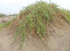 而且我的水平根系生命力很顽强,即便风沙把我连根吹起,让我没办法从土壤获取养分和水分,我也能通过和自己相连的沙埋分株存活下来,生长、开花并结果。