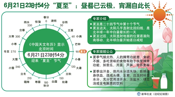 “昼晷已云极,宵漏自此长。”《中国天文年历》显示,北京时间6月21日23时54分迎来“夏至”节气。专家表示,夏至后不久,一年中最热的时候将随即到来,值此时节,公众要清淡饮食,及时补水,注意戒躁戒怒,保持乐观的情绪。