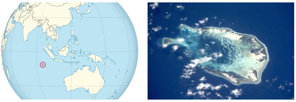 左:科科斯(基林)群岛(Cocos (Keeling) Islands)在地球上的位置,by TUBS;右:科科斯(基林)群岛卫星照片 | by NASA