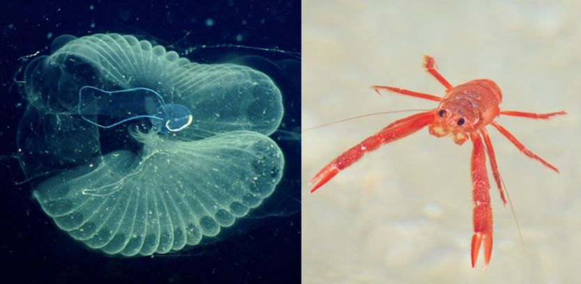 海洋生物以微小的有机颗粒为食,比如巨型幼虫 (左) 和远洋红蟹 (右) ,它们可能会不小心吞食水下数百米深处的塑料微粒 | 图片来源:Scientific Reports