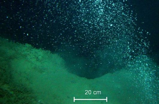 2003年拍摄到的挪威海域Håkon Mosby 泥火山逸散到海水中的甲烷气泡。图片来源:参考文献[5]