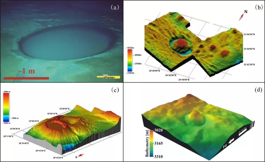(a)地中海的那不勒斯(Napoli)泥火山上某喷口的海底摄像;(b)地中海的那不勒斯(Napoli)泥火山高50m,直径1km ;(c)埃及大陆边缘的“双子泥火山”;(d)加迪斯湾的泥火山,高约100m,直径约1km | 图片来源:参考文献[1][2]