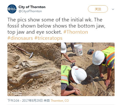 桑顿市官方Twitter账号最近分享了挖掘工作人员的一些照片。官员解释说,博物馆科学家现在进行挖掘,建筑工人现在已经停止了工作。除了获取三角龙化石之外,研究人员还将搜索该地区是否存在其他化石。三角龙化石将最终将被安置在丹佛自然科学博物馆。