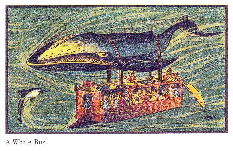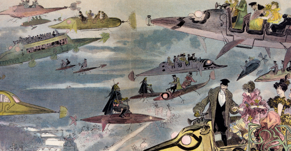 20世纪初的预测者们对我们的日常旅行不会局限于陆地上的想法着迷。例如,法国艺术家让-马克⋅科特和他的合作者在1899年到1910年间制作了一系列明信片,他们似乎很有信心,认为到2000年的时候,我们已经可以在天空和海洋上殖民了,并出于运输目的招募更多居民。