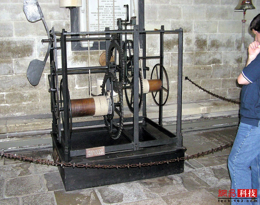 索尔兹伯里大教堂的中世纪时钟:在1928年,一位时钟爱好者参观了索尔兹伯里大教堂的塔钟,并且有了独特的发现。另外一座铁钟也位于塔钟内,而且似乎被忽视了好几代。尽管他的发现饱受争议,但是他发现的这座钟被认为是大教堂最初所使用的机械钟,能够追溯到1386年,这也就使它成为世界上仍然工作的最古老时钟。 当这座中世纪时钟最初被安放在一座单独的钟楼内时(1789年拆除),索尔兹伯里大教堂仍然非常年轻。这座时钟没有钟盘,它的目的只有一个,那就是准点响起帮助当地人留意时间。尽管它已经不再发出钟响声,但是经过大量的修复工作之后,它已经与600年前非常相似,在教堂北侧走廊中缓慢的计时。