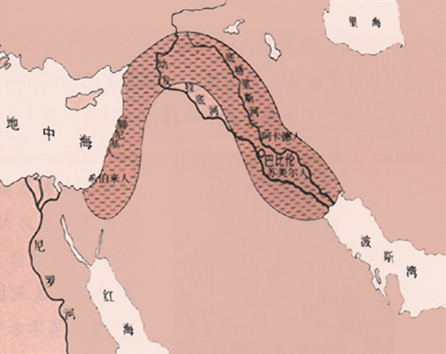 新月沃土图,从波斯湾到地中海构成了一个新月形状的地理区域,区域内降水相对较多,并且水源充足,可以发展种植业,是古代的人口密集区域。这个区域内,延续不断的形成了许多文明群体,其中,较早的苏美尔文明就诞生于这个区域内。