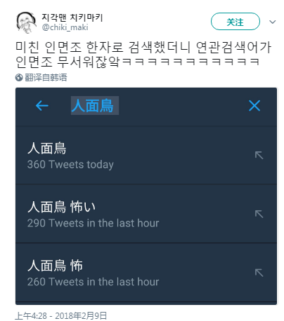 “인면조”或Inmyeonjo字面翻译为“人面鸟”。韩国推特趋势标签“인면조너무”被翻译成为“人面鸟太...,”韩国网友以不同的方式完成了这个句子,包括“人面鸟太可怕了”及“人面鸟太帅气了”等。人们对这种动物有这样或那样的强烈的感觉,但对于它是否可怕存在分歧: