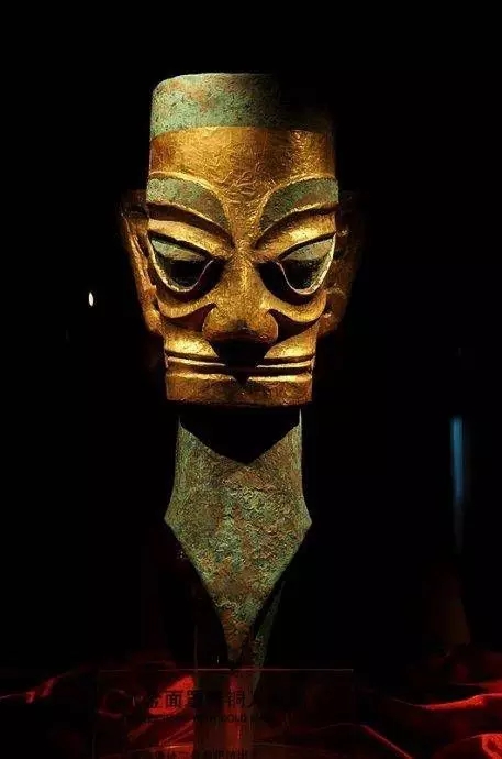 三星堆出土戴金面罩的青铜人头像