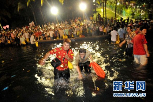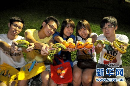 马来西亚男女参加“抛柑接蕉”活动。新华社发 张纹综摄