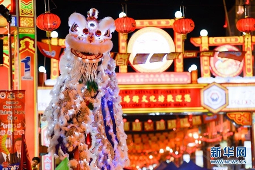 2013年马来西亚元宵节,马六甲武术龙狮总表演舞龙舞狮,大闹元宵。新华社发 张纹综摄