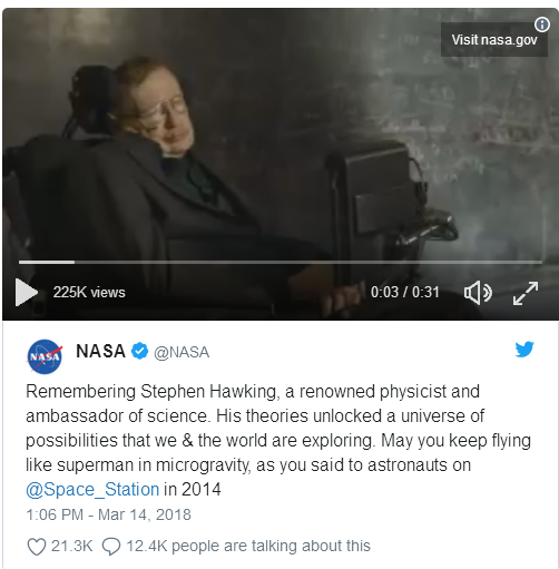 美国国家航空航天局(NASA)也发推文称:“他的理论打开了我们探索世界的各种可能性。愿他可以像微重力一样继续飞行。”
