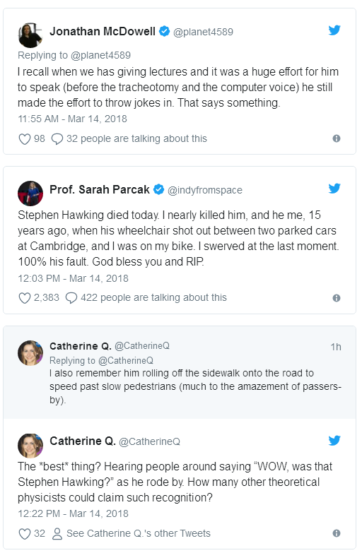 对于霍金的去世,歌手凯蒂·佩里写道,“我心中有一个巨大的黑洞。”