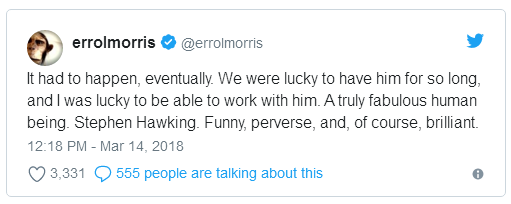 埃罗尔·莫里斯(电影《时间简史》的制作者)写道,霍金是“一个真正像神话一般的存在”。