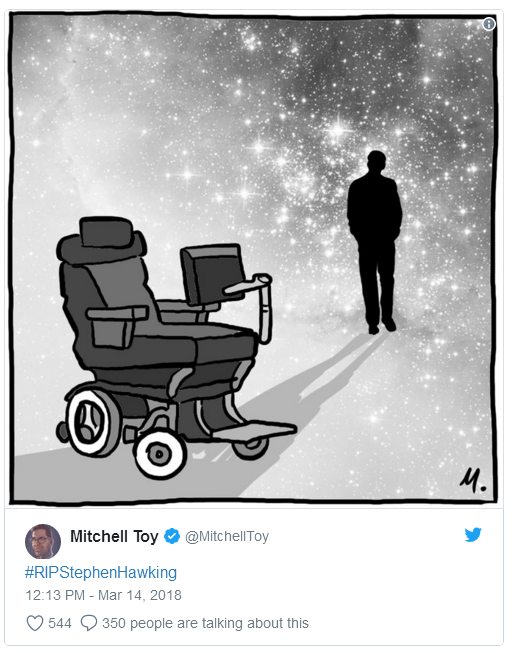 随着霍金逝世的消息传开,一张空轮椅的图像在社交媒体上分享。科技圈中,万维网创始人Tim Berners先生是第一个回应他的死讯的人之一,他在Twitter上说:“我们失去了一个杰出的头脑和美丽的心灵”。