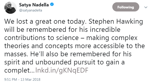谷歌CEO 桑达尔·皮查伊称,“世界失去了一个美丽心灵和智慧的科学家。安息,史蒂芬·霍金。”