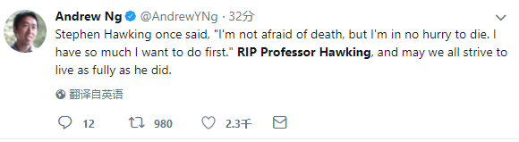 人工智能专家吴恩达悼念道,史蒂芬·霍金曾说,“我不畏惧死亡,但我不想那么快步入死亡。我想要做的还很多。”安息吧,霍金教授。也祝愿我们都能像他一样活得出彩。”