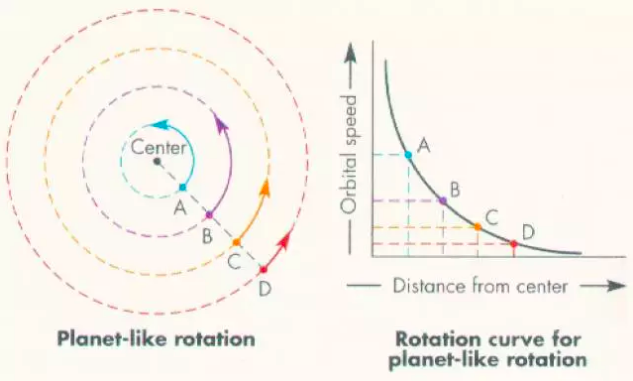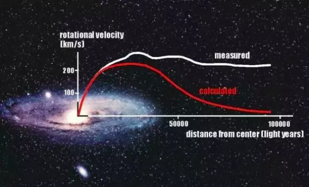 理论预测星系的旋转速度会随着距离递减(红色曲线),但实际观测到则完全出乎意料(白色曲线)。如果没有额外的质量提供引力,那么星系早已分崩离析。