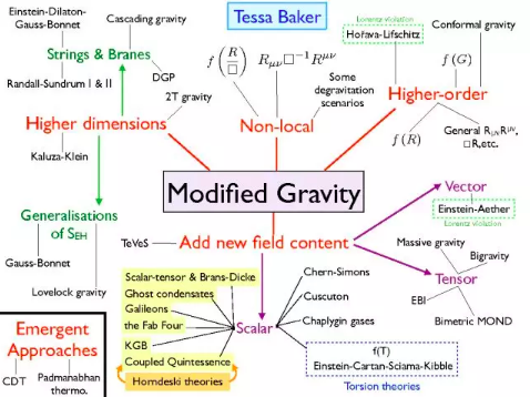 但我们真的需要暗物质和暗能量吗?或许它们根本就不存在?只是我们需要重新思考什么是引力。其实在爱因斯坦发表广义相对论不久后,爱丁顿、外尔、克鲁扎和克莱因等人就已经开始寻找其它的替代理论。广义相对论的替代理论被统称为“修正引力理论”(Modified Gravity)。近一个世纪以来,物理学家已经提出了许多相关理论,下面这张图表列出了大部分的修正引力理论: