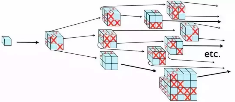 在永恒暴胀理论中,暴胀永远不会停止。图中红色X的记号代表暴胀停止的区域,比如我们的宇宙。绿色则代表暴胀继续的区域,会一直无限持续下去。(图片来源:E.Siegel)