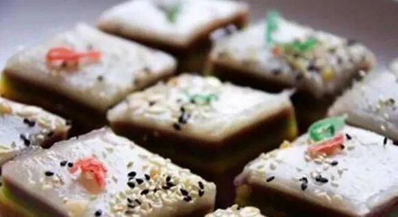 重阳糕又称花糕、菊糕、五色糕。讲究的重阳糕要做成九层,像座宝塔,上面还做成两只小羊,以符合重阳(羊)之义。